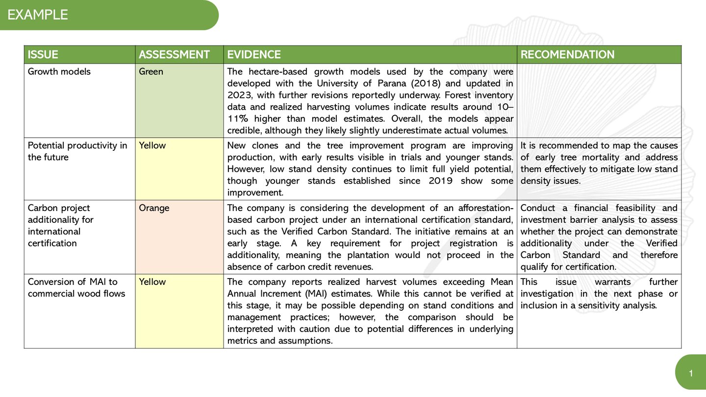 We specialize in technical and financial nature asset due diligence, with focus on natural capital: forestry, carbon, and agriculture.